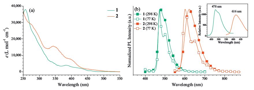 | Figure 2. UV-vis absorption (a) and emission (b, normalized) spectra of complexes 1 and 2 in dichloromethane (1 - 10-5 mol/L). Inset: the emission spectra of complexes 1 and 2 (5 - 10-5 mol/L) in water containing 1% DMSO (v/v) at 298 K. | |