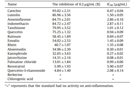 We detected the anti-inflammatory ability of herbal extracts using the convenient method, i.e., in vitro cell model to find out effective herbs in the treatment and prevention of gout. In this study, 33 herbal extracts and 16 standards were detected. From Table 4 we can see that most herbal extracts have the anti-inflammatory activity at 0.2 mg/mL. The inhibition rate of Ginkgo Folium, Salviae Miltiorrhizae Radix et rhizome, Rhei Radix et Rhizoma, Polygoni Cuspidati Rhizoma et Radix, Selaginellae Herba, and Paeoniae Radix Rubra was all more than 90%. Moreover, Scutellarlae Radix, Lonicerae Japonicae Flos, Bupleuri Radix, Glycyrrhizae Radix et Rhizoma and Schisandrae Chinensis Fructus also showed anti-inflammatory activity with lower IC50. The antiinflammation effect was evaluated using indometacin as a comparator. As shown in Table 5, the standards possessed similar ability of anti-inflammation. Catechin, luteolin and amentoflavone were better than the other standards on inflammation at 0.2 μg/mL. Catechin, quercetin, rutinum, aloeemodin, palmatine chloride, jatrorrhizine and kaempferide possessed lower IC50 compared with indometacin. In short, the anti-inflammatory performance of most flavonoid standards was better than that of the other standards.