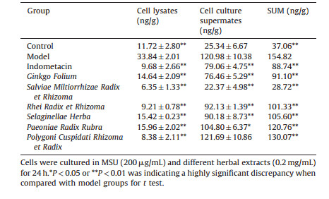 The results for expressions of ICAM-1 and IL-1β are respectively shown in Tables 2 and 3, which demonstrates that both the expressions of ICAM-1 and IL-1β were significantly increased (P < 0.01) in a dose-dependent manner with the different concentrations of MSU in cell lysates and cell culture supernates. We calculated the sum of cell lysates and cell culture supernates at different concentrations. From these tables we can see that both of the expressions of ICAM-1 and IL-1β were also significantly increased (P < 0.01) compared with the control group. ICAM-1 and IL-1β could influence the cell viability under MSU-stimulation. This might be due to the fact that the intracellular substances were activated after stimulating with MSU to produce ICAM-1 and IL-1β and they could damage cells as inflammatory cytokines do. IL-1β could promote the recruitment of neutrophils through the upregulations of E-selectin and ICAM-1 expressions by the endothelial cells [27]. Therefore, this model is useful for studying the pathological mechanism of acute gout on anti-inflammation induced by MSU. To screen the anti-gout traditional herbs from TCM, in this research, the anti-inflammatory mechanism of herbal extracts was observed through the expressions of ICAM-1 and IL-1β.