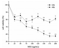 3. Results and discussion 3.1. The effect of MSU on HUVEC by MTT assayThe HUVECs were damaged directly by MSU-stimulation to establish a cell model in vitro [21, 22], and then the antiinflammatory ability of drugs was studied. The cell viability was used as evaluation criterion by an MTT assay. This method is simple, fast and economical on screening anti-gout drugs. In our experimental in vitro study (Fig. 1), the cell viability was monotonously decreased in a dose-dependent manner with the increases of MSU concentration at 24 h. The cell viability remained stable at 175-200 μg/mL (175 μg/mL: 57.32%±1.81%; 200 μg/mL: 57.58%±1.27%). By contrast, the data were irregular fluctuations at 48 h. Moreover, the data revealed that cells were damaged more seriously by MSU-stimulation at 24 h. Thus, we chose the 200 μg/mL MSU and 24 h as the optimal conditions to assess the ability of drugs on inflammation.