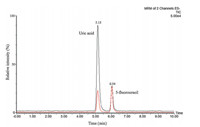 | Figure 2. The total ion chromatograms of uric acid and 5-fluorouracil. Black represents the enzyme reaction without inhibitor. Red represents the enzyme reaction with inhibitor (allopurinol). | |