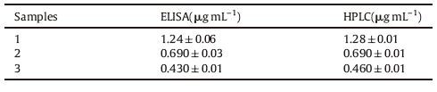 2.8. Comparison of HPLC and ELISA analyses.We conducted HPLC to compare its results to that of the developed ELISA analysis. To prepare the samples for HPLC we took the blood samples and 10 mL caffeine as the internal standard into 1.50 mL heparinized Ep tube, then added 1.00 mL ethyl acetate. The tube was vortex oscillated for 3 min, then centrifuged for 10 min for 1.34 × 10-4 r min-1 . 900mL of the supernatant was collected in another centrifuge tube, blow dried by N2, redissolved by 50% methanol compound solvent, vortex oscillated for 3 min, and finally centrifuged for 10 min for 1.34 × 10-4 r min-1 60 mL of the supernatant was used for HPLC detection.