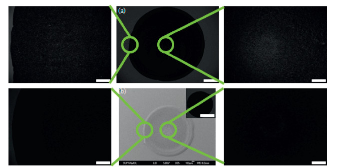 | Figure 3. (a, b) Optical microscope images of SiO2 microspheres deposition on PS film with PEO additives with (a) and without (b) O2 plasma. The scale bar is 1 mm in (a) and (b), and 250 mm in the others optical microscope images. | |