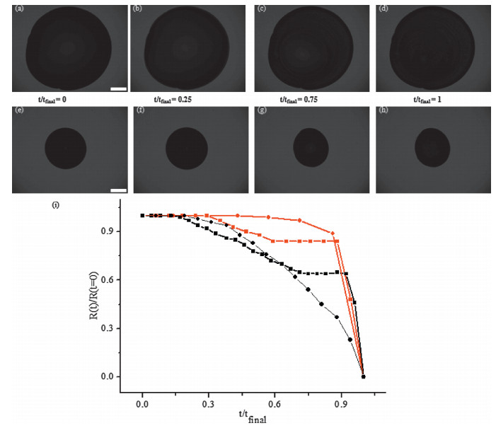 | Figure 4. (a-h) Experimental optical microscope images at different times (t/tfinal) with PEO (1.5 g/L in concentration) additives during the evaporation of a droplet of SiO2 microspheres suspension; shown are data for SiO2 microspheres on PS film with (a-d) and without (e-h) O2 plasma. The scale bar is 1 mm. (i) The radius, R, of droplets of different suspensions is plotted versus time, t, for evaporating droplets. Suspensions of SiO2 microspheres with PEO additives on PS film with (black circle) and without (black square) O2 plasma. Suspensions of SiO2 microspheres without PEO additives on PS film with (red circle) and without (red square) O2 plasma. To facilitate comparisons, the time is normalized by the time evaporation ends (tfinal), and R is normalized by the value of R at t=0 min. | |