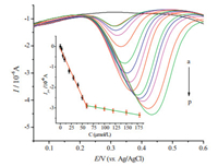 | Figure 6. DPVs of the PANI-rGO-NF/GCE in 0.01 mol/L PBS (pH 5.0) with increasing concentrations of DA (a→p: 0, 0.05, 3, 6, 9, 10, 20, 30, 40, 50, 60, 80, 100, 120, 150, 180 μmol/L). The insets show the plots of the peak current (Ipa) vs. the concentrations of DA (C). | |