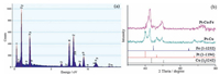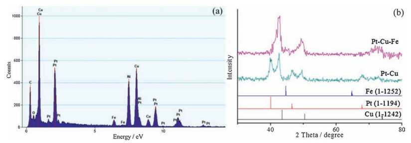 | Figure 1. (a) EDS spectrum and (b) XRD patterns of Pt-Cu-Fe NCs. | |