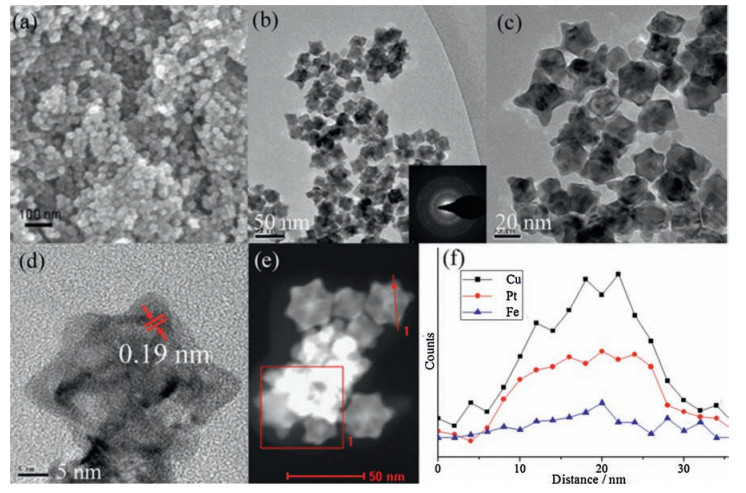 Fig. 2a shows a representative FE-SEM image of the assynthesized materials (Pt-Cu-Fe NCs), which displayed uniform and well-dispersed nanoparticles. The morphology and structure of the NCs were further characterized by TEM (Fig. 2b, c). The selected-area electron-diffraction (SAED) pattern (inset of Fig. 2b) of the as-synthesized materials indicates the high crystallinity of the NCs. Careful measurements revealed that mainly one type of lattice fringe with an interplanar spacing of 1.90 Å (Fig. 2d), which can be ascribed to the (100) plane, is present in the sample. HAADFSTEM images (Fig. 2e) also confirmed the concave structure of the NCs. As shown in the single-particle STEM-EDS line-scan profiles (Fig. 2f), the distributions of Pt, Cu and Fe in the NCs were in good agreement with their cubic or concave shapes. According to our previous work [13], Pt-Cu-Fe NCs were synthesized in two major steps. First, Cu NCs were formed after reduction, and then Pt and Fe nucleated at the edges and faces of the Cu-rich NCs via galvanic replacement to form NCs with a concave surface morphology.
