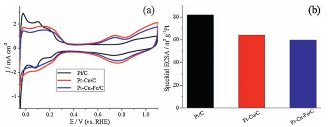 | Figure 4. (a) Cyclic voltammograms (CVs) and (b) special ECSAs of Pt-Cu-Fe/C, Pt-Cu/C and Pt/C in 0.5 mol L-1 H2SO4. | |