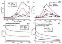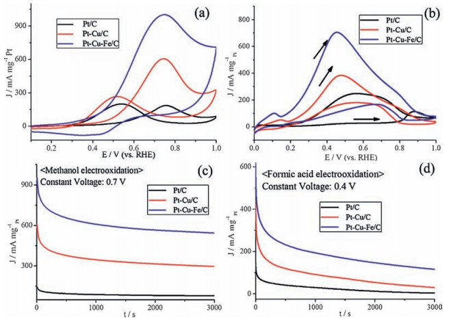 | Figure 5. Cyclic voltammograms (CVs) of Pt-Cu-Fe/C, Pt-Cu/C and Pt/C in (a) 0.5 mol L-1 H2SO4/0.5 mol L-1 CH3OH and (b) 0.5 mol L-1 H2SO4/0.5 mol L-1 HCOOH.Chronoamperometric curves (CA) for the same samples in (c) 0.5 mol L-1 H2SO4/0.5 mol L-1 CH3OH at 0.70 V and (d) 0.5 mol L-1 H2SO4/0.5 mol L-1 HCOOH at 0.40 V. | |