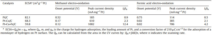 Prior to electrocatalytic activity measurements, Pt0.3Cu0.6Fe0.1 and Pt0.3Cu0.7 NCs were deposited on a carbon support by sonicating a mixture of NCs and carbon supports [13]. Fig. 4a shows the cyclic voltammograms (CVs) of Pt-Cu-Fe/C, Pt-Cu/C and Pt/C recorded at ambient temperature in N2-purge 0.5 mol L-1 H2SO4 solution at a sweep rate of 50.0 mV s-1. The CV curves exhibited two distinct potential regions associated with hydrogen adsorption/desorption processes between (-0.05 V and +0.40 V), and the formation of adsorbed hydroxyl species layer beyond~0.5 V. The electrochemically active surface area (ECSA, Fig. 4b) of the samples was estimated using the electric charge accumulated during hydrogen adsorption, and found to decrease in following order: Pt/C > Pt-Cu/C > Pt-Cu-Fe/C (Table 1). The ECSAs of Pt-CuFe/C, Pt-Cu/C, and Pt/C were estimated to be 60.8, 68.3, and 82.1 m2 g-1 metal, respectively.