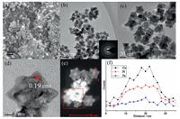 | Figure 2. (a) FE-SEM, (b, c) TEM and magnified TEM, inset of (b) SAED pattern, (d) HAADF-TEM, (e) HAADF-STEM, and (f) STEM line-scan profile of Pt-Cu-Fe NCs. | |