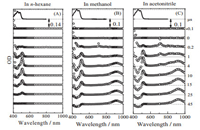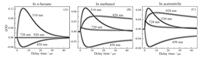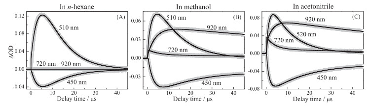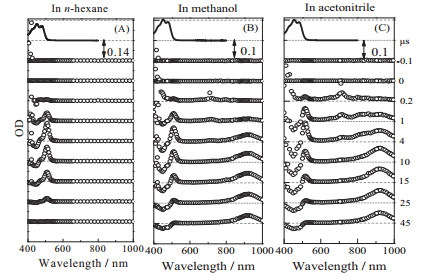 Fig. 2 shows the transient absorption spectra at indicated delay times of β-Car in n-hexane (A), in methanol (B), and in acetonitrile (C), respectively, in the 400-1000 nm region.