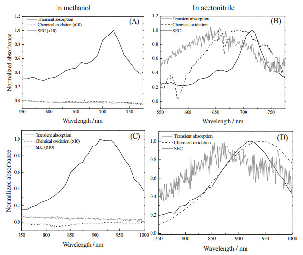 In acetonitrile, both the three methods could produce the~720 nm and~920 nm centered peak (Fig. 4B and D). For 720 nm species, both the SEC and chemical oxidation give the broader, but partly overlapped absorption in comparison to the transient absorption (Fig. 4B). But they may not originate from the same species, since the 720 nm species only have a several microsecond lifetime in transient absorption measurement, while in chemical oxidation (Fig. S3B in Supporting information) and in SEC it has the lifetime of over minutes. For the 920 nm species, chemical oxidation produces well matched spectra with that obtained by transient absorption, and the SEC produces a broader spectral pattern with seemingly multi-components (Fig. 4D). Based on the very ‘long' lifetime of 920 nm species in acetonitrile detected by transient absorption, observing it at a visible time scale is reasonable. Actually the 920 nm species observed by chemical oxidation could survive in several decade minutes in acetonitrile (Fig. S3B).