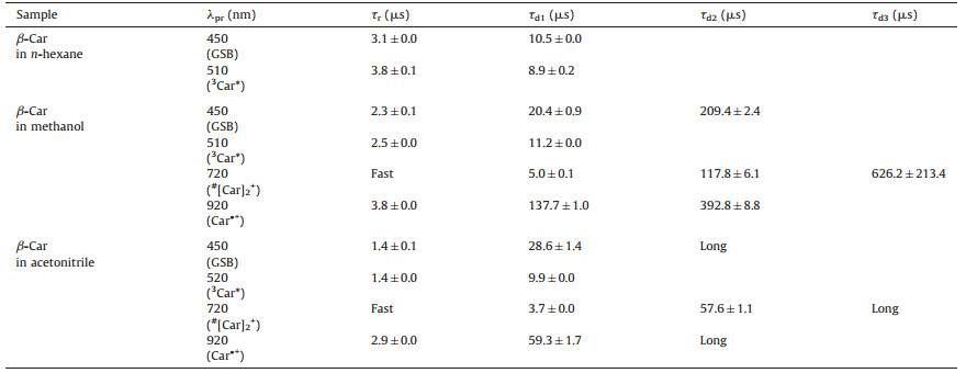 4. ConclusionTransient absorption in the microsecond time domain is usually used to study the excitation triplets and long-lived radicals of carotenoids [18, 20, 39, 45]. And the photophysical and photochemical mechanism depends not only on sensitizer [40-42], but also the solvents [18, 20, 42, 43].