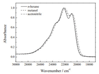 3. Results and discussion 3.1. Solvent effects on anthracene-sensitized triplet excitation dynamics of β-CarFig. 1 shows the steady-state absorption spectra of β-Car in nhexane, in methanol, and in acetonitrile, respectively. The broad and intense absorption in 19, 000-28, 000 cm-1 (357-526 nm) originates from the S2←S0 absorption, which apparently has a different solvent effect from that of the carbonyl carotenoids [43]. Here, polarity of the solvents was not an obvious effect on the spectral pattern of β-Car, even when the polarity P(ε) variation is quite large (Table S1 in Supporting information). Since the polarizability R(n) of the three solvents used in this study are similar (Table S1), the S2←S0 absorption has no obvious shift which is reasonable [23].