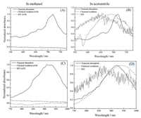| Figure 4. The absorption comparison of carotenoid cationic species obtained by transient absorption (black solid line), by chemical oxidation (black dash line) and by spectroelectrochemical (SEC) method (gray line) for β-carotene measured in methanol ((A) and (C)) and acetonitrile ((B) and (D)), respectively. | |