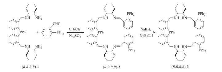 3. Results and discussionThe condensation of chiral aminophosphine ligand (R, R, R, R)-1 and o-(diphenylphosphine) benzaldehyde proceeded in CH2Cl2 for 48 h, obtaining a pale yellow solid (R, R, R, R)-2 in 97% yield. Reduction of (R, R, R, R)-2 with excess NaBH4 was carried out in refluxing ethanol, giving the corresponding P3N4-type amine ligand (R, R, R, R)-3 as a white solid in 90% yield, which features the HRMS signals at 1063.5117 (M+H). The 31P NMR spectrum of (R, R, R, R)-3 in CDCl3 solution exhibited three singlets at δ -15.84 (-PPh2), -15.86 (-PPh2), and -25.81 (-PPh). Compound (R, R, R, R)-3 contains four chiral carbon atoms and seven possible coordination sites, which is hopeful to exhibit unique performance in both coordination chemistry and asymmetric catalysis.