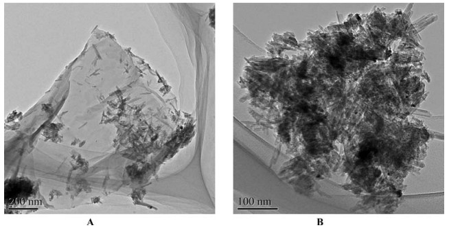 | Figure 2. TEM images of (A) MnO2 NWs, (B) GO/MnO2 nanocomposite. | |
