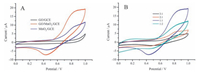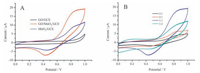 | Figure 4. (A) CVs of GO/GCE, GO/MnO2/GCE and MnO2/GCE and (B) CVs of 3 GO/MnO2/GCE (1), 2 GO/MnO2/GCE (2), GO/MnO2/GCE (3), GO/2MnO2/GCE (4), in the presence of 0.2 mmol L-1 H2O2 in 0.1 mol L-1 PBS (pH 7.0). scan rate: 100 mV s-1. | |