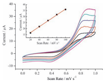 | Figure 5. CVs of the GO/MnO2/GCE in the presence of 0.3 mmol L-1 H2O2 at different scan rates (20, 40, 60, 80, 100 mV s-1) in 0.1 mol L-1 PBS (pH 7.0). Inset is the plot of oxidation peak current with scan rate. | |