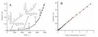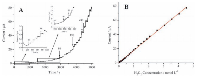 | Figure 7. (A) Amperometric current curve of the GO/MnO2/GCE with the successive addition of H2O2 into the 0.1 mol L-1 PBS (pH 7.0) under stirring at 0.75 V. Inset is the amplification of the marked rectangle region shown in the curve, the unit for the added H2O2 is mmol L-1. (B) The corresponding calibration curves of the current response versus H2O2 concentration. | |