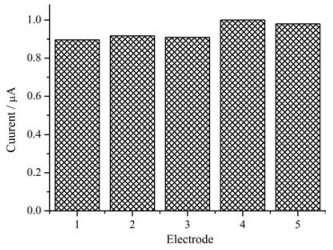 | Figure 9. The current response of five different GO/MnO2 electrodes to 0.10 mmol L-1 H2O2. | |