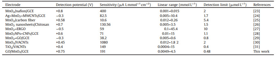 Table 1 Comparison of the present GO/MnO2 sensor with other H2O2 sensors based on MnO2. |