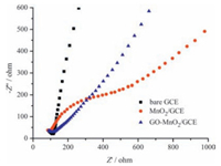 | Figure 3. Nyquist plots of bare GCE, MnO2/GCE, GO/MnO2/GCE in 0.1 mol L-1 KCl solution containing equimolar [Fe (CN)6]3-/[Fe (CN)6]4- (0.01 mol L-1/0.01 mol L-1) at 100 mV s-1. | |
