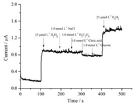 | Figure 8. Amperometric responses of GO/MnO2/GCE on successive injections of 25 mmol L-1 H2O2, 1.0 mmol L-1 NaCl, 1.0 mmol L-1 H2C2O4, 1.0 mmol L-1 citric acid, 1.0 mmol L-1 glucose and 25 μmol L-1 H2O2 in N2-saurated 0.1 mol L-1 PBS (pH 7.0) at 0.75 V. | |