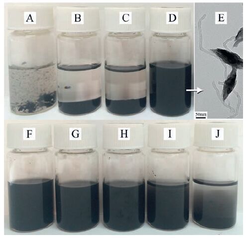 | Figure 1. Digital photos of solution dispersion of (A) GE; (B) GE/MWCNTs; (C) GE/(Py- PPDO)2-b-PEG; (D) Digital photo and (E) TEM image of (Py-PPDO)2-b- PEG@MWCNTs; Digital photos of GE/(Py-PPDO)2-b-PEG@MWCNTs with different feed ratio of GE to MWCNTs (F) 1:9, (G) 2:8, (H) 3:7, (I) 4:6, (J) 5:5. | |