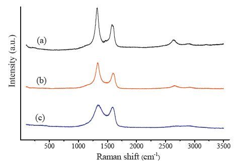| Figure 2. Raman spectra (excitation at 632.8 nm) of (a) MWCNTs, (b) (Py-PPDO)2-b- PEG@MWCNTs, and (c) GE/(Py-PPDO)2-b-PEG@MWCNTs hybrid. | |