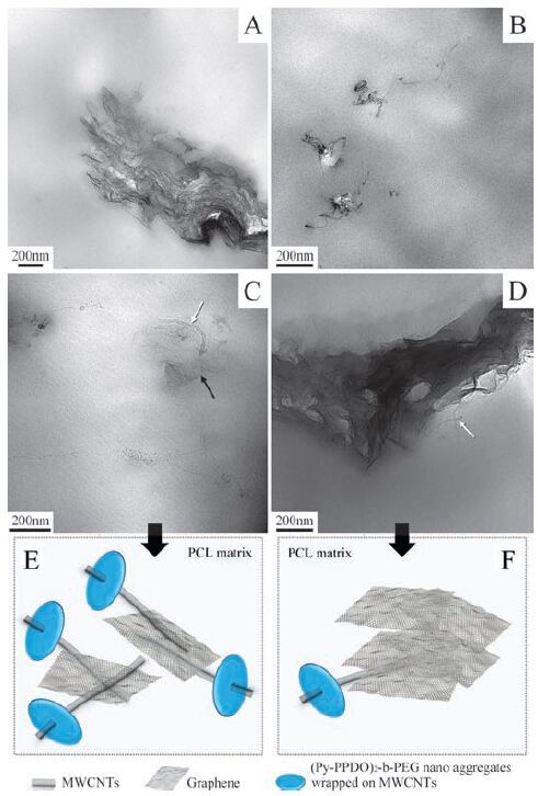 | Figure 3. TEM images of composites films of PCL/GE (A); PCL/(Py-PPDO)2-b- PEG@MWCNTs (B); PCL/GE/(Py-PPDO)2-b-PEG@MWCNTs with different GE/MWCNTs weight ratios (C) 2:8; (D) 5:5, the weight content of nanofiller is 0.06 wt%. Schematic illustration of interconnection of (Py-PPDO)2-b- PEG@MWCNTs and GE with different ratio of GE to MWCNTs (E) 2:8, (F) 5:5. | |