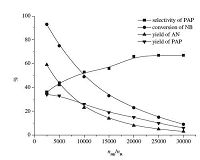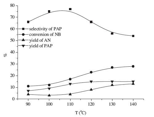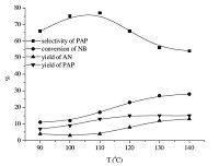 The reaction was studied within a range of temperatures 90-140 ℃ and the results were shown in Fig. 5. The selectivity of PAP increased from 65% to nearly 75% when the temperature increased from 90 ℃ to 110 ℃, and then decreased from 75% to=% with the temperature's further increase from 110 ℃ to 140 ℃. This may because that the yield of AN continued increasing with temperature's increase but the yield of PAP was almost constant when the temperature increased from 110 ℃ to 140 ℃. Meanwhile, the color of the reaction liquid changes gradually from pale yellow to dark brown when the temperature was higher than 110 ℃, as a result of PAP's conversion to other byproducts such as 4, 4'-diaminodiphenyl ether [32]. Therefore, 110 ℃ was chosen for the following studies.
