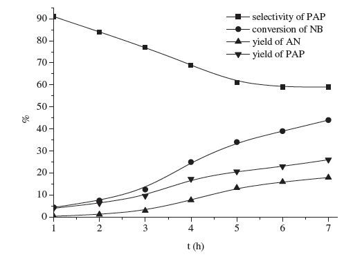 The reactionwas studied by changing the reaction time from1 to 7 h, the yield of PAP and the yield of AN increased, the selectivity of PAP showed a continuous decrease from 90% to 60% but it was higher than 82% within 2 h (Fig. 7). With the prolongation of reaction time, the selectivity of PAP decreased along with nNB/nPt's decrease, and the result was consistent with the results in Fig. 3. Another probable cause of PAP selectivity's decrease may be that the generated PAP in the system might convert to other byproducts such as 4, 4'-diaminodiphenyl ether [32].