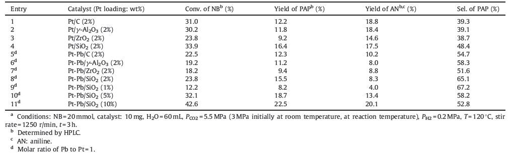 In summary, supported Pt-Pb bimetallic catalysts were proven to be selective for the hydrogenation of NB to PAP in pressurized CO2/H2O system. When the reaction was carried out at 110 ℃ under 0.2 MPa H2 and 5 MPa CO2 for 2 h by employing Pt-Pb/SiO2 as catalyst, PAP's selectivity was up to 82%.