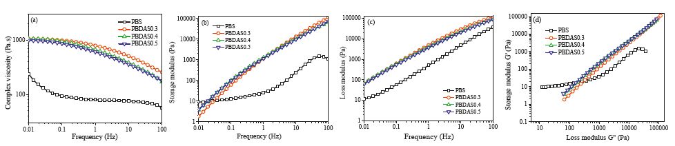 | Figure 1. Dynamic rheological (a) complex viscosities vs. frequency, (b) storage modulus G' vs. frequency, (c) loss modulus G" vs. frequency and (d) storage modulus G' vs. loss modulus G" for neat PBS and PBDASx. | |