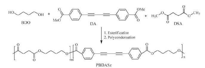 Diacetylene group is prone to cross-linking reaction under UVirradiation or at high temperature [8-10]. In this study, a functional monomer containing a diacetylene group, dimethyl 4, 40- (buta-1, 3- diyne-1, 4-diyl) dibenzoate (DA), was designed and synthesized. It was found that DA can partly cross-linked at the melt polymerization temperature (Fig. S1 in Supporting information), and therefore a small amount of DA is copolymerized with 1, 4-butanediol, and dimethyl succinate to prepare PBS copolyesters. It is expected that the slightly-cross-linking reaction caused by DA will increase the melt strength/viscosity and the crystallization rate of PBS.