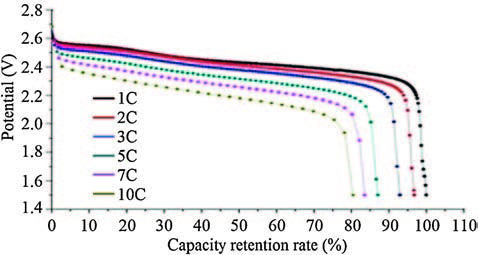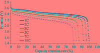 | Figure 2. The potential curves by capacity retention rate of 1C capacity collected at 30 ℃ with different discharge rate. | |