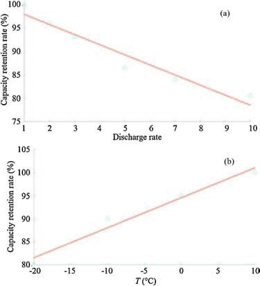 | Figure 5. Linear fit of capacity retention rate and discharge rate (a) and temperature (b). | |