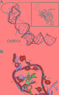 Figure 3. (A) The tertiary structure of OriRNA (the orange one represented OriRNA produced by RNAComposer; the green one represented OriRNA influenced by the induced fit docking based on the orange one). The box described X-ray crystal structure of coat protein in complexation with nucleotide GAA of OriRNA (PDB ID: 2TMV). (B) The interaction mode of compound 4j at the binding site of OriRNA. |