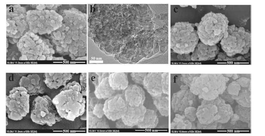| Figure 2. SEM images of nitrided hierarchical porous ZSM-5 (a: ZSM-5, c: 0.5N-ZSM-5, d: 1N-ZSM-5, e: 1.5N-ZSM-5, f: 2N-ZSM-5) and TEM image of unmodified hierarchical porous ZSM-5 (b). | |