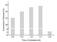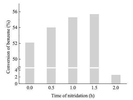 As shown in Fig. 3, with the time of nitridation increased from 0 to 1.5 h, the conversion of benzene increased from 52.1% to 55.7%, indicating that nitridation could prompt the alkylation of benzene. However, further increasing the time of nitridation to 2 h, the benzene conversion decreased sharply. Therefore, 1.5 h was considered as an adequate nitridation time for the modification of hierarchical porous ZSM-5.