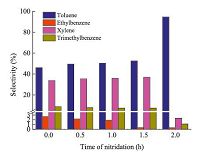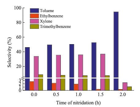 Fig. 4 exhibits the selectivity of products on nitrided catalyst; it can be seen that nitridation has a significant influence on the product distribution. The selectivity of ethylbenzene reduced from 2.7% to 0.3% and the selectivity of toluene and xylene increased from 45.9% to 52.4% and 33.6% to 36.9% respectively after increasing the nitridation time from 0 to 1.5h, indicating that nitrided catalyst was with the ability to suppress the production of ethylbenzene and promote the formation of toluene and xylene. In addition, the decrease of ethylbenzene selectivity also proved that the side chain alkylation of toluene and methanol to form ethylbenzene could not occur over nitrided ZSM-5 and this phenomenon was consistent with the literature reported by Zhang et al. [14]. We also noted that on 2.0NZSM-5 catalyst, the selectivity to toluene was increased to 94.4% while the selectivity to other products were greatly decreased. Moreover, a large amount of methanol and dimethyl ether were observed in the reaction products, suggesting that the catalyst was insufficient for catalyzing the alkylation of methanol as well as methanol to olefins reactions.In addition, the catalytic performance of the none NH3 treated sample (treated at 800 ℃ for 2 h in N2 flow alone) was similar to that of untreated ZSM-5 (Fig. S1 in Supporting information), indicating that the change of catalytic performance of nitrided catalyst was caused by nitridation, rather than high-heat treatment.