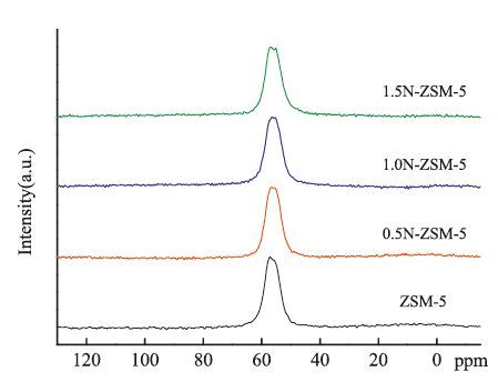 In order to understand the chemical environment surrounding the Al atoms of the nitrided catalyst samples, the solid-state 27Al MAS NMR spectra was employed. As shown in Fig. 5, a large signal at ~54 ppm was detected which could be a result of the tetrahedral-coordinated framework of Al with four Al-O-Si bonds. In addition, the peak at 0 ppm which corresponding to the extra-framework octahedral Al was not observed. All the samples showed a similar structure of tetrahedral coordinated framework of Al species, indicating the influence of nitridation on the local chemical environment around the Al atoms was negligible.