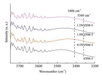 Since the zeolites were treated with amines to produce a strong basic catalyst, several research groups have investigated the mechanism of nitridation and the acid-base properties of nitrogen-incorporated zeolites [12, 14, 20-24]. Many literatures have reported that nitrogen could be incorporated into the samples via the formation of Si-NH-Si species and Si-NH2 starting from Si-OH-Al and Si-OH, respectively [24-27]. Fig. 8 shows the FTIR spectra ranging from 3200 to 4000 cm-1 of unmodified and nitrided hierarchical porous ZSM-5 which were treated under nitrogen at 673 K for 1 h in order to eliminated the effect of adsorbed water before the IR measurements were taken. The band in the range of 3650-3750 cm-1 was assigned to Si-OH groups. After nitridation, there is little change in the adsorption spectrum for these bands except a new small band at 3406 cm-1 and a shoulder band at 3360 cm-1. According to related literature [27], the band at 3406 cm-1 correlates to the stretching vibration of NH from Si-NH-Si group and the shoulder band at 3360 cm-1 correlates to the stretching vibration of NH from Si-NH-Al group. It indicates that some O atoms in Si-OH-Si and Si-OH-Al groups were replaced by N atoms, forming Si-NH-Al and Si-NH-Si groups. The band at 3406 cm-1 and 3360 cm-1 reveals nearly flat absorption peaks, which indicates the amount of Si-NH-Si and Si-NH-Al formation is very low. The reason for this may be that there are fewer acid sites on the ZSM-5 zeolite with high SiO2/Al2O3 ratio (360), and the nitridation time of the samples is very short. It should be noted that the -NH2 groups were unstable in nitridated samples and could be removed easily during the pretreatment (400 ℃) [27]. As compared to -NH2 groups, the Si-NH-Si species were more stable under the reaction conditions. Moreover, the formation of Si-NH-Al species were at the expense of the Si-OH-Al species which corresponds to the Brönsted acid sites. Therefore, the Brönsted acidity of hierarchical porous ZSM-5 was reduced by nitridation and this inhibited the unwanted reaction of methanol to olefins, thus, the formation of ethylbenzene was suppressed and the alkylation of benzene was promoted in turn. We also noted that the excessive reduction of the Brönsted acid sites was unfavorable for the alkylation reaction due to the insufficient amount of active sites [19]. This explained the significant decrease of benzene conversion on 2.0N-ZSM-5.