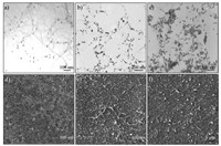 | Figure 4. TEM and SEM images of Au@c-CNT nanohybrids derived from the aqueous solutions of Au nanoparticles (10-4 mg mL-1) and c-CNTs (0.05 mg mL-1) at volume ratios of (a) and (d) 1:10, (b) and (e) 1:2, and (c) and (f) 1:1. | |