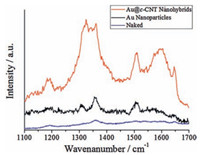 | Figure 6. SERS spectra of Rh6G (10-5mg mL-1) dropped on naked, Au-coated and nanohybrid-coated SiO2/Si wafers. | |