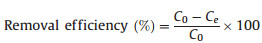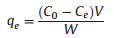 where qe was the amount of metal ions adsorbed per unit amount of CMCH (mg/g); C0 and Ce were the initial concentrations of metal ions and the final or equilibrium concentrations of metal ions, respectively (mg/mL); V was the volume of metal ions solution (mL), and W was the weight of CMCH (g).