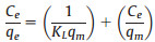 where Ce was the equilibrium concentration of metal ions in solution (mg/L), qe was the amount of metal ions adsorbed at equilibrium (mg/g), qm represented the maximum adsorption capacity of CMCH (mg/g) and KL was the Langmuir constant (L/mg) related to the affinity of binding sites and the energy of adsorption. The values of qm and KL were determined from the slope and intercept of the plots of Ce/qe versus Ce.