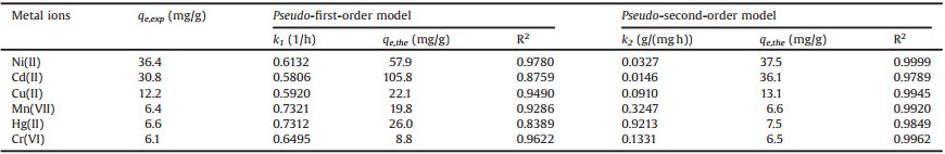 Fig. 6 shows the relationship between the contact time and adsorption capacities of CMCH for Ni (Ⅱ), Cd (Ⅱ), Cu (Ⅱ), Hg (Ⅱ), Mn (Ⅶ) and Cr (Ⅵ). The adsorption capacities were significantly increased within 7h at 298K. Obviously, the adsorption capacities reached equilibrium beyond 7h. To interpret the adsorption kinetics of metal ions onto CMCH, the pseudo-first-order equation and the pseudo-second-order equation were employed to explain the adsorption mechanism. The pseudo-first-order equation was represented by the following equation [24]: